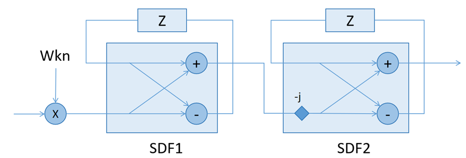 Потоковая архитектура Radix-4 имеет минимальную задержку обработки сигнала. Radix-4 отличается от стандартного решения Radix-2, основанного на перегруппировке и разделении БПФ/ОБПФ. Radix-4 имеет log4 (N) стадий, где N — длина БПФ. Каждая стадия содержит два примитива с задержкой обратной связи (SDF).